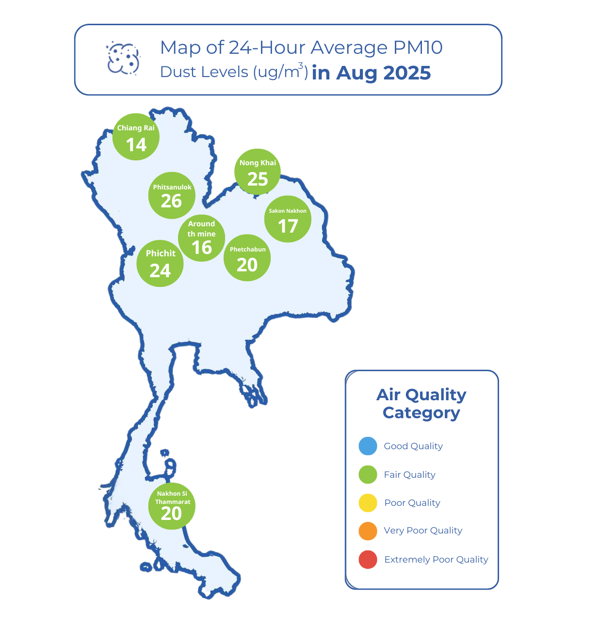 The air quality at Chatree exhibits seasonal variations, with respirable dust and total suspended particles increasing during the dry season and decreasing in the wet season.