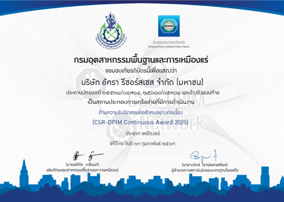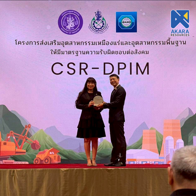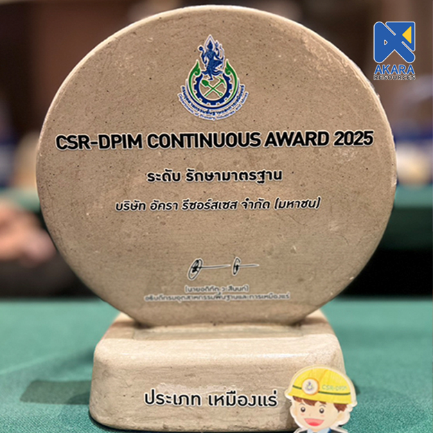 On 19 February 2026, Akara Resources Public Company Limited was presented with the CSR-DPIM Continuous Award 2025, recognising enterprises that consistently demonstrate corporate social responsibility. The award was conferred by the Department of Primary Industries and Mines. Ms. Yuwathida Phuk-on, Community Relations and Sustainable Development Manager, accepted the award on behalf of the company from Mr. Aditad Vasinonta, Director-General of the Department of Primary Industries and Mines.
